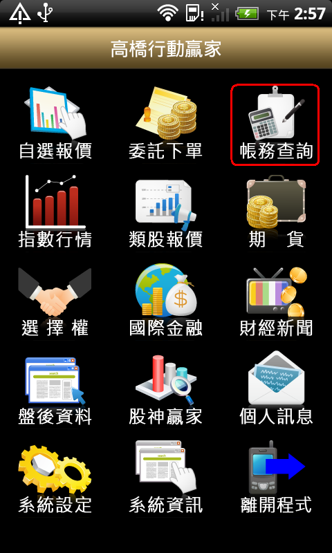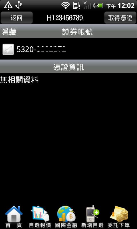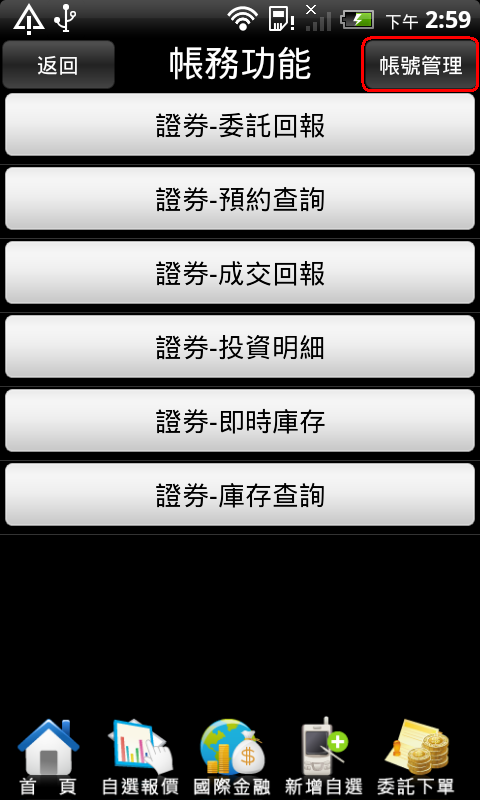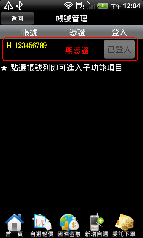 手機端:請先登入【高橋行動贏家】,點選 【帳務查詢】後,選擇【帳號管理】,選取您的帳號後,接著請移至電腦上操作憑證上傳功能。