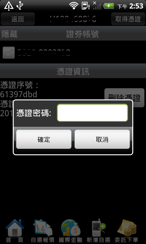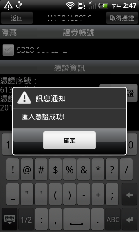 電腦完成送出後,手機點選右上方的【取得憑證】會出現輸入密碼的畫面,接著輸入自設的憑證下載密碼〈電腦送出時設定的密碼〉並點選【確定】,此時手機會接收到個人電腦上傳的憑證,並出現【匯入憑證成功】的訊息,點【確定】完成手機憑證下載。